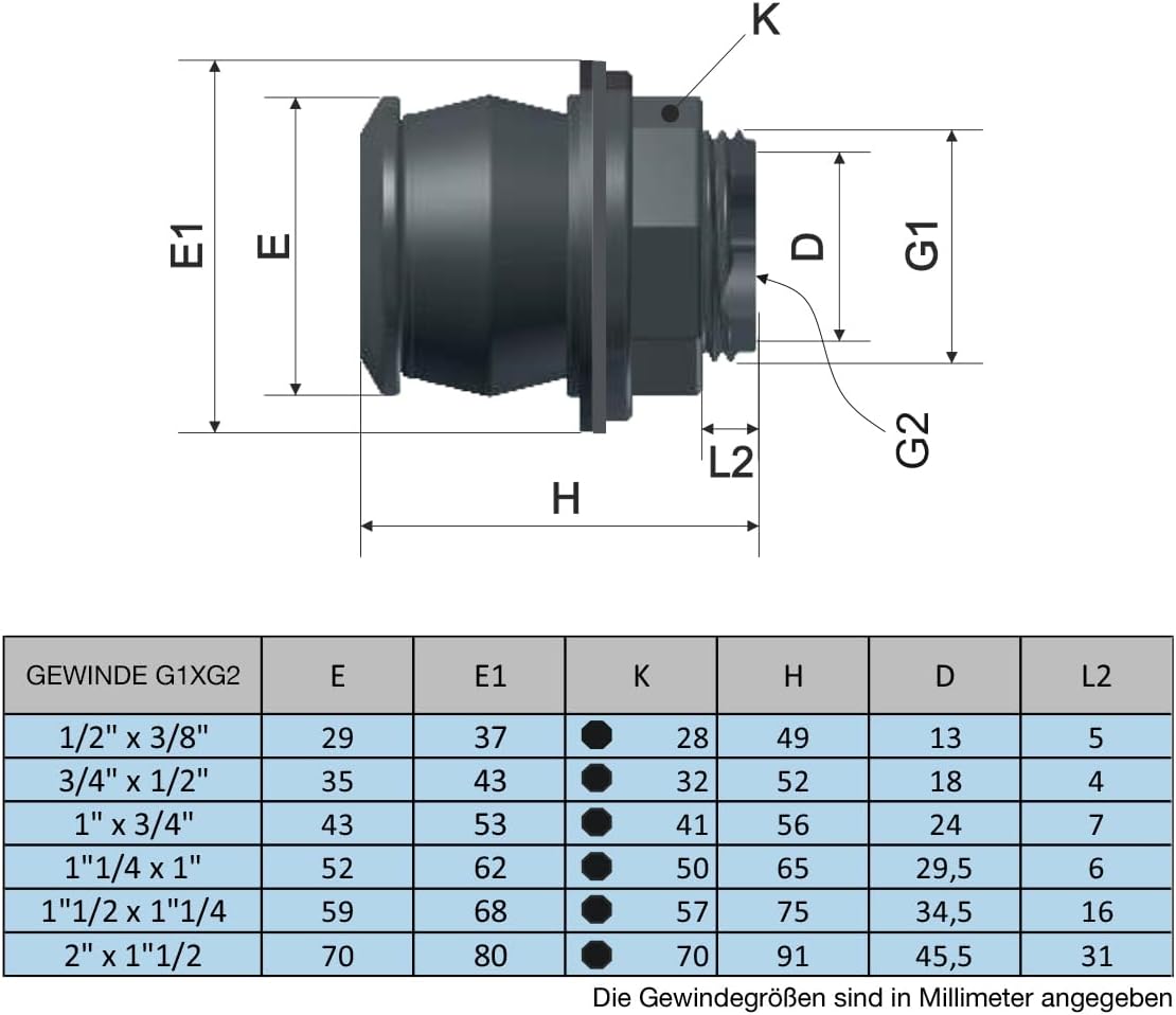 Tankdurchführung: Polypropylen (PP), glasfaserverstärkt (Geeignet für den Kontakt mit Lebensmittelflüssigkeiten. Phthalatfrei (gemäß UE-Richtlinie 10/2011 und EG-Richtlinie 1935/2004)