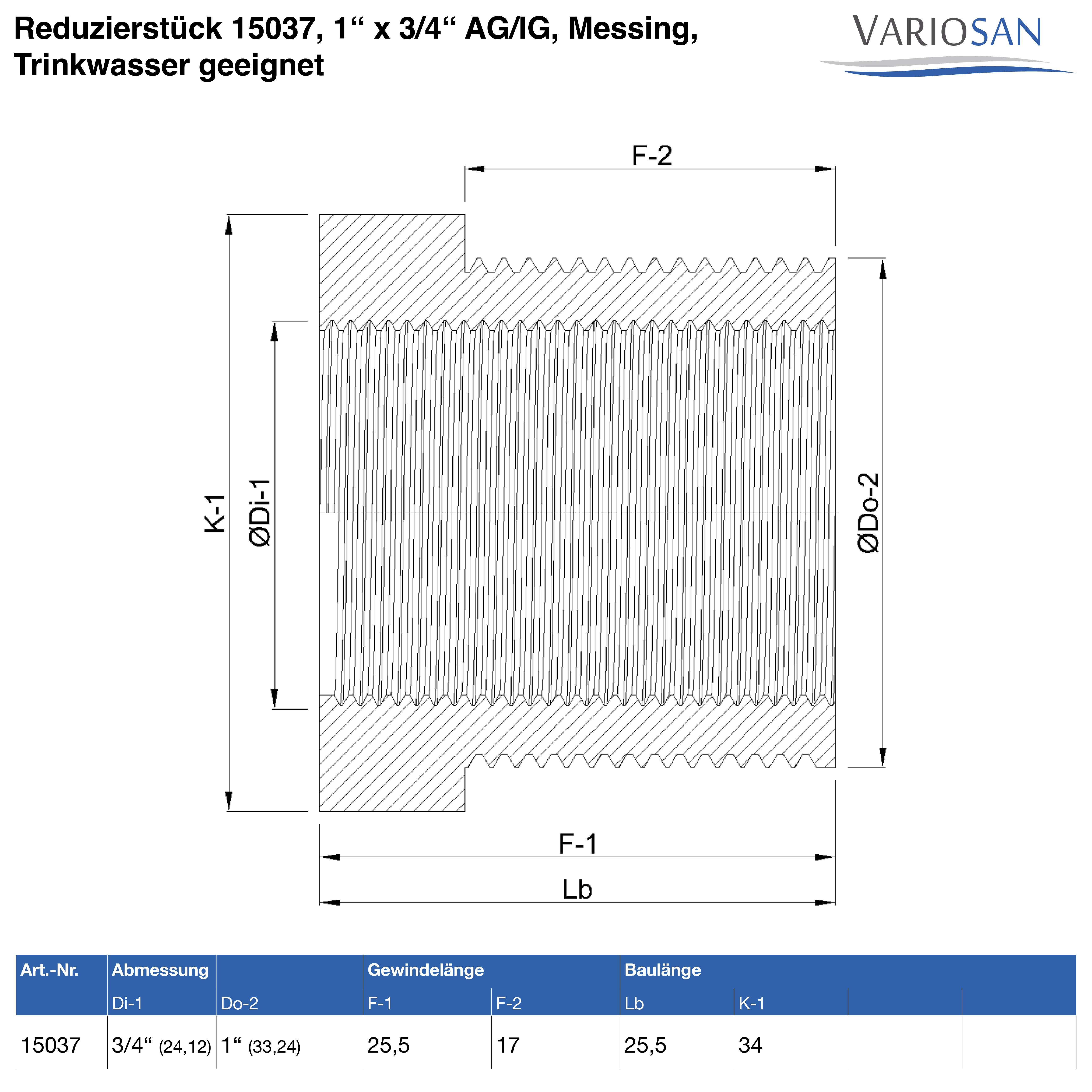 VARIOSAN Reduzierstück 15037, 1" x 3/4" AG/IG, Messing, Trinkwasser geeignet