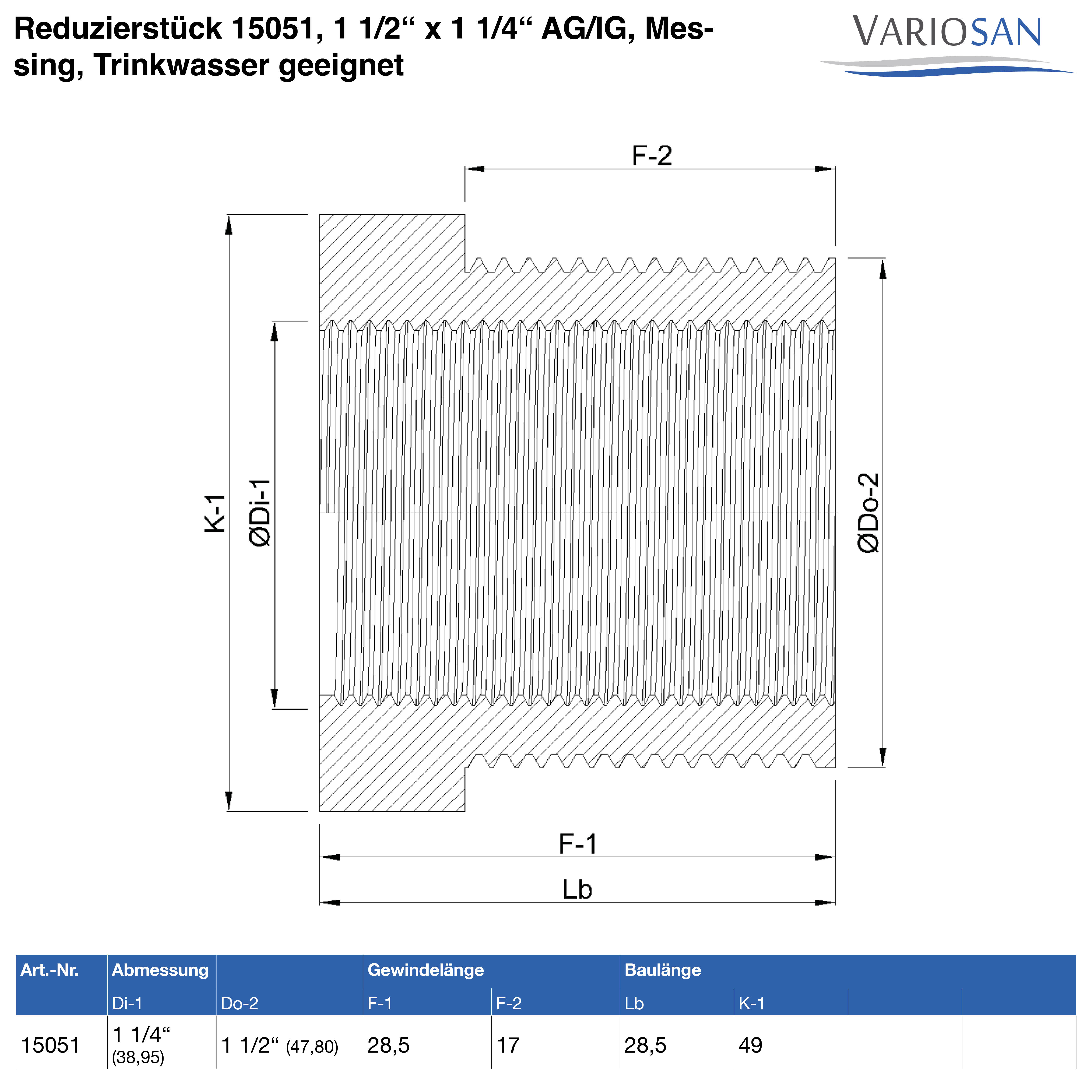 VARIOSAN Reduzierstück 15051, 1 1/2" x 1 1/4" AG/IG, Messing, Trinkwasser geeignet